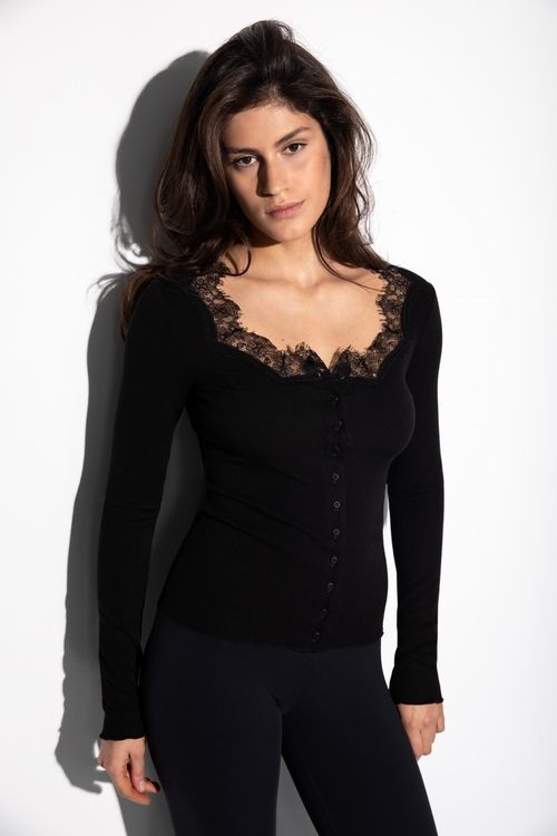 A timeless basic top featuring delicate French Chantilly lace along the neckline. Crafted from premium Italian viscose with a touch of elastane for the perfect fit. The front is fastened with buttons, while the placket is finished with 100% silk stitching for a refined, luxurious detail. Available in two versatile shades — classic black and soft ivory.